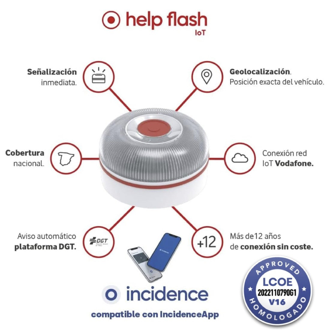 Incidence es una aplicación de seguridad vial que ha alcanzado un acuerdo con Help Flash ya que es la única luz que dispone de tecnología Bluetooth. Incidence funciona de forma autónoma y tiene una funcionalidad extra con Help Flash Smart y con Help Flash IoT by Vodafone.